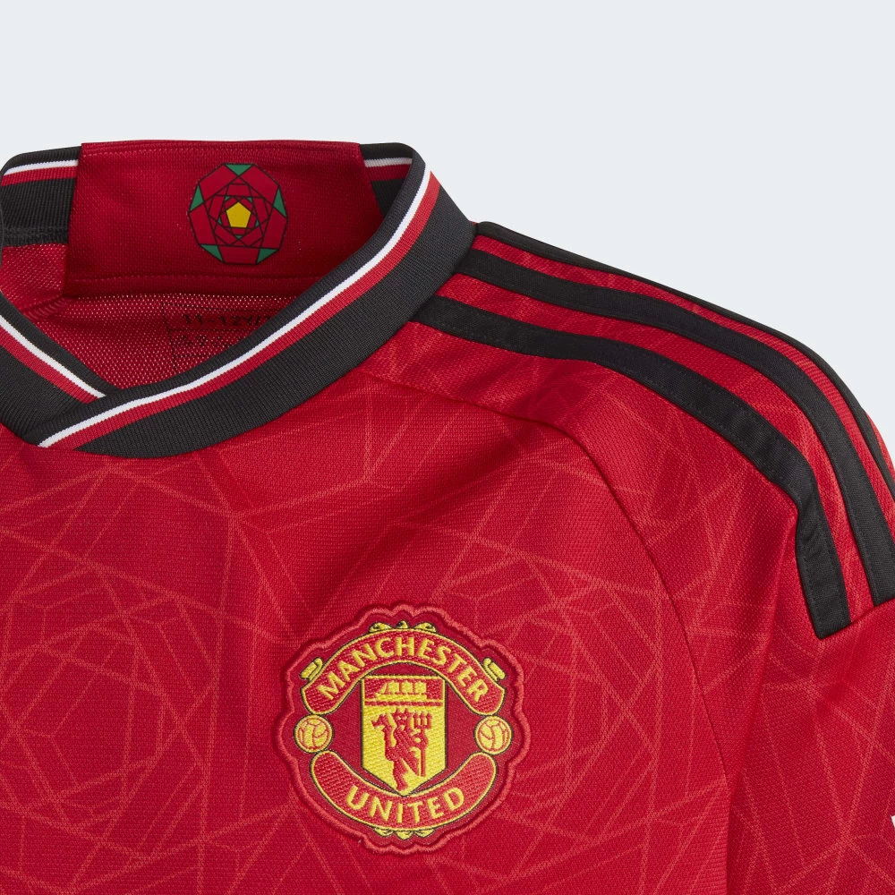 Like club, like city. This juniors’ adidas Man Utd soccer jersey forms a cast iron link to Manchester’s global influence. Taking design elements from a nearby Industrial Revolution-era bridge, it displays a repeating Lancashire Rose-inspired geometric pattern on the front. Moisture-wicking AEROREADY and woven team details ensure it keeps fans comfortable and proud of their team. Made with 100% recycled materials, this product represents just one of our solutions to help end plastic waste.