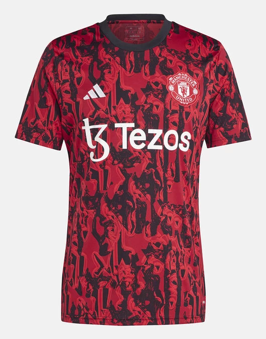 Show your team’s colors with pride in the Manchester United Pre-Match Jersey. Sporting the shade that the Red Devils are famous for, this jersey is designed to ignite high-energy performances pre-game. The jersey’s glitched graphic seamlessly combines the legendary red devil of Manchester United with Lancashire’s iconic red rose. Behind the eye-catching design, moisture-absorbing AEROREADY works hard to help keep you feeling comfortable on and off the pitch. With the embroidered club badge on display, everyone will know where your loyalties lie.