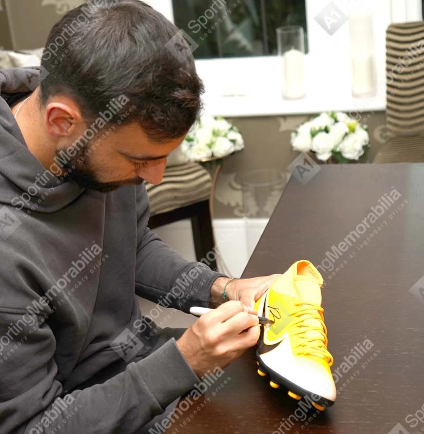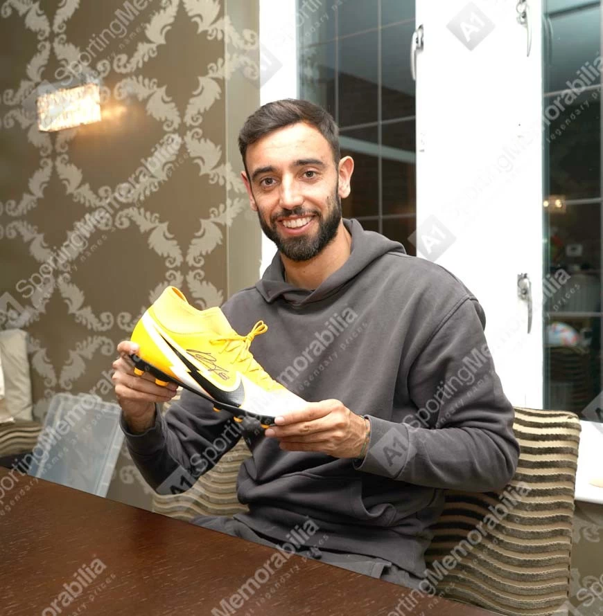 Bruno Fernandes signed football boot. Personally hand signed by Bruno Fernandes at a private signing session in Manchester on 14/10/2022. Each item comes complete with its own official certificate of authenticity which serves as proof that your item is genuine. The item is presented in our unique photo acrylic display case with an action photo presented behind the item to create a stunning piece of signed sports memorabilia. Some basic assembly of this photo acrylic display case is required. Clear instructions of how to assemble your photo acrylic display case will be provided.