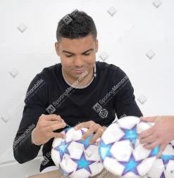 Casemiro signed football. Personally hand signed by Casemiro at a private signing session in Manchester on 22/05/2023. Each item comes complete with its own official certificate of authenticity which serves as proof that your item is genuine. The football is presented in a clear acrylic display case that creates a stunning piece of signed sports memorabilia.