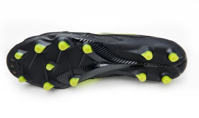 Men’s football boot in water-resistant, full-grain “soccer” leather. Anti-stretch fabric lining and non-slip PU heel lining. Insole with flex points on the ball of the foot. Perfect for firm ground.