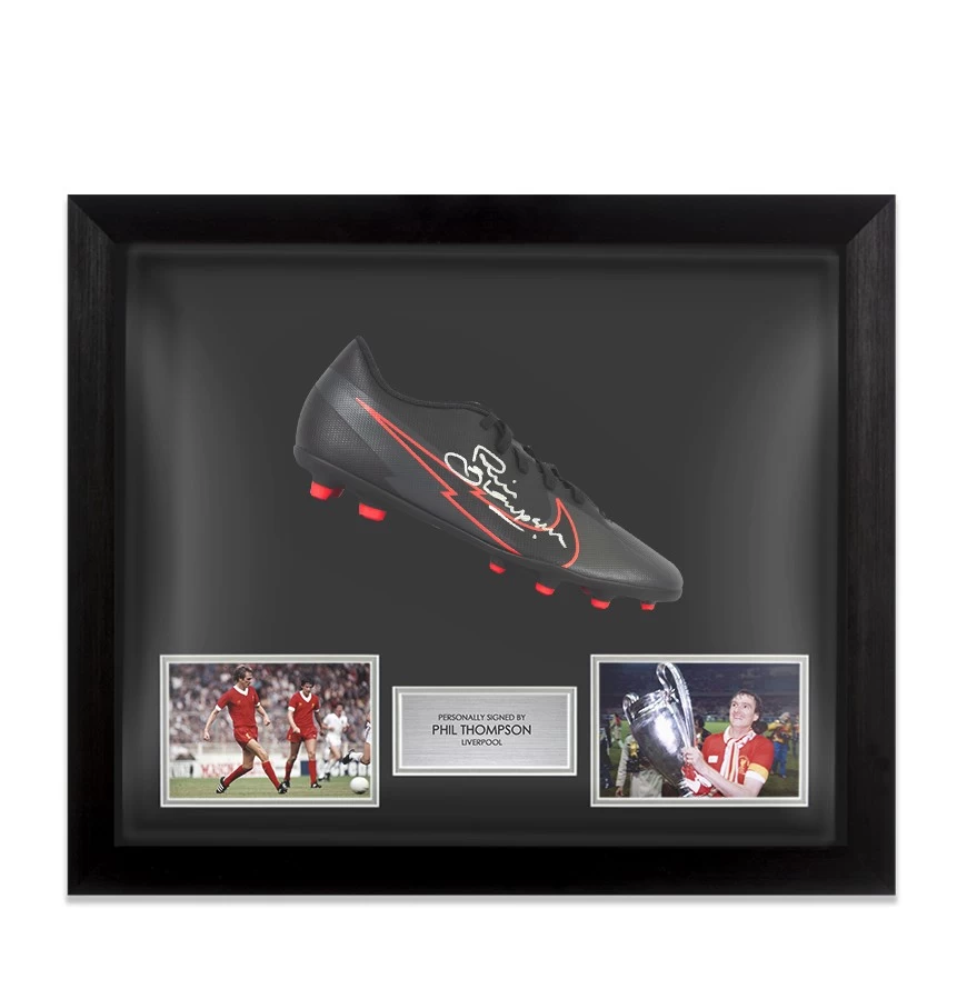 Phil Thompson signed football boot. This boot features a fantastic, clear signature personally hand signed by Phil Thompson at a private signing session for A1 Sporting Memorabilia in Liverpool on 06/07/2021. Each item comes complete with its own official Certificate of Authenticity which serves as proof that your item is 100% genuine. Expertly framed in a bespoke dome display with quality black frame, two action pictures and descriptive plaque.