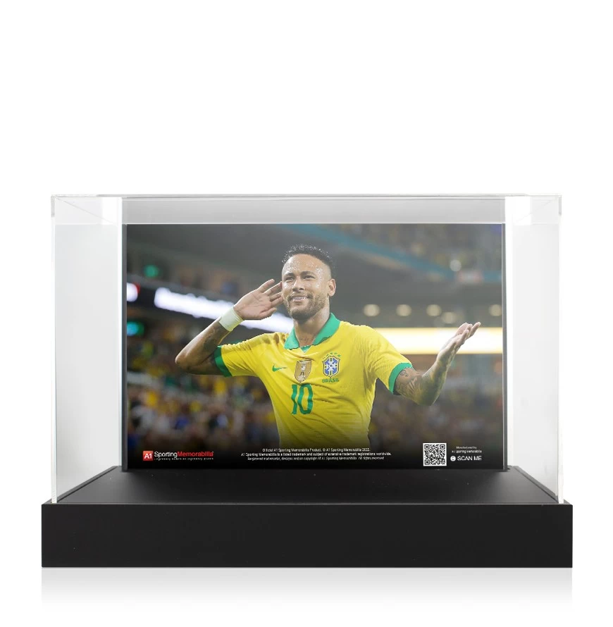 Neymar Jr signed football boot. Personally hand signed by Neymar Jr at a private signing session. Each item comes complete with its own official certificate of authenticity which serves as proof that your item is genuine. The item is presented in our unique photo acrylic display case with an action photo presented behind the item to create a stunning piece of signed sports memorabilia. Some basic assembly of this photo acrylic display case is required. Clear instructions of how to assemble your photo acrylic display case will be provided.