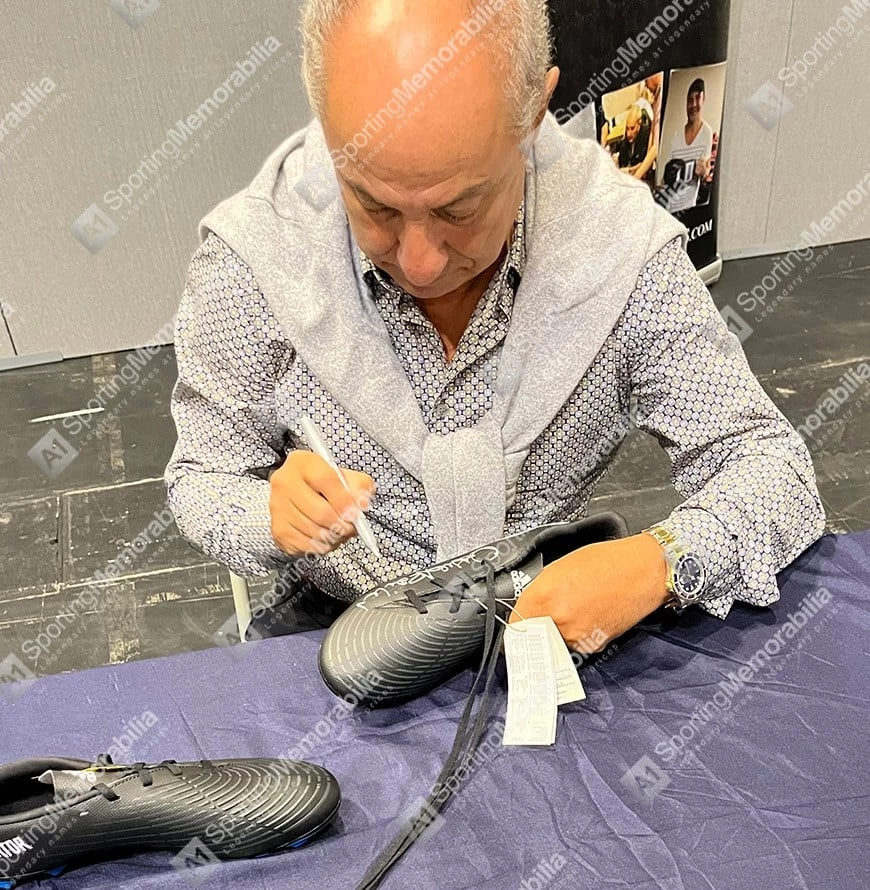 Ossie Ardiles signed football boot. Personally hand signed by Ossie Ardiles at a private signing session in Birmingham on 04/09/2022. Each item comes complete with its own official certificate of authenticity which serves as proof that your item is genuine. The item is presented in a clear acrylic case with a mirrored base that creates a stunning piece of signed sports memorabilia.