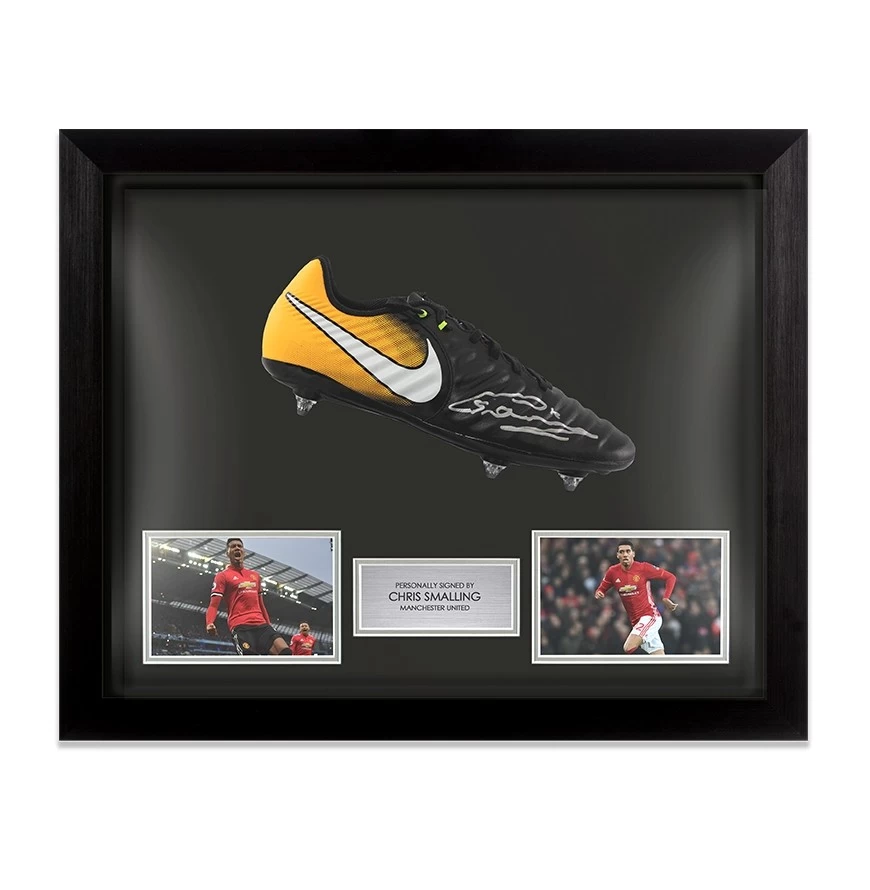 Chris Smalling signed football boot – Nike Tiempo. Personally, hand signed by the player himself at an organised signing session held by A1 Sporting Memorabilia. Expertly framed in a bespoke dome display with a quality black frame, two action pictures, and descriptive plaque.