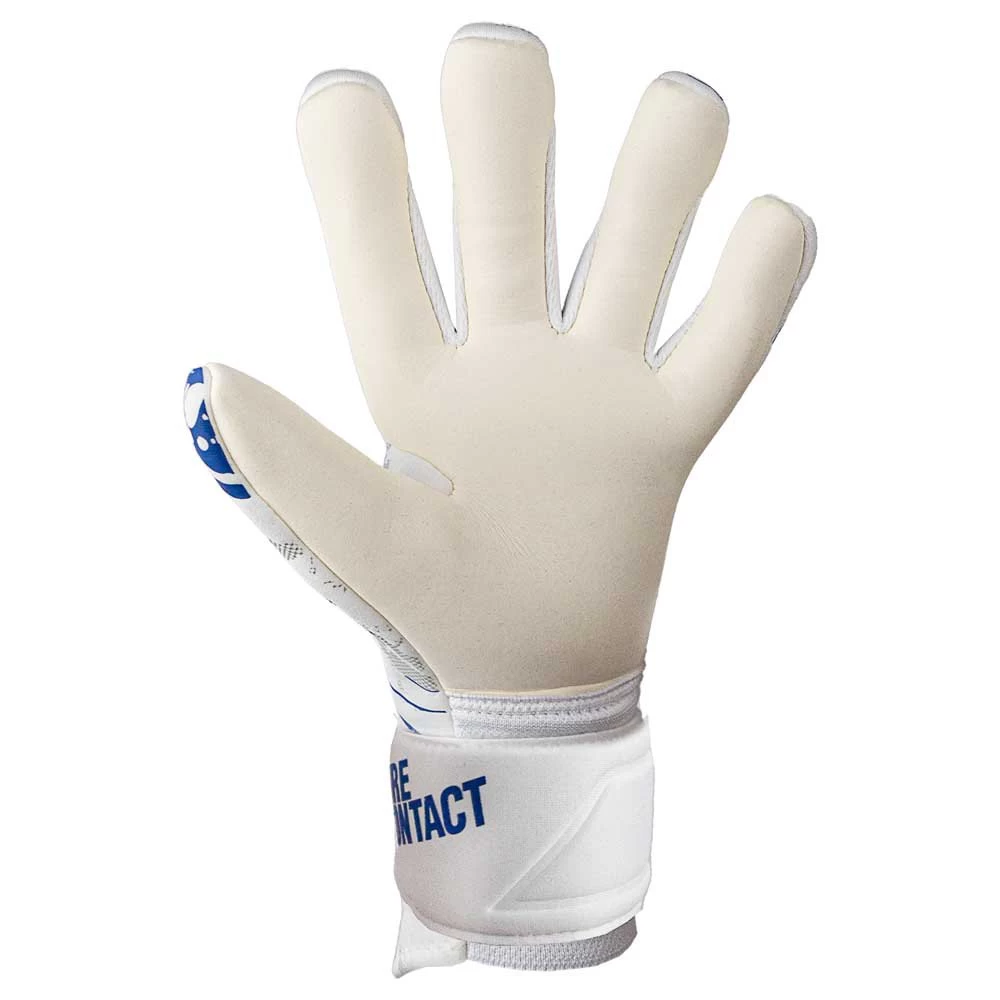 This super light goalkeeper junior glove provides a second-skin fit and maximum of flexibility. The high-volume German-made Reusch Grip Silver Latex guarantees outstanding impact absorption, good grip, and reliable abrasion resistance. The long, steady cuff and full elastic strap let you feel even higher stabilization around the wrist. Get impressed by this classy white, blue colorway with the two main brand elements on the backhand of the right and left glove.