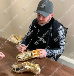 This stunning gold football boot was hand-signed by Manchester Untied & England top goal scorer Wayne Rooney. This football boot features a perfect autograph signed permanent pen – hand signed at a private signing session with A1 Sporting Memorabilia in Manchester on 23/04/2021. Each item comes complete with its own Certificate of Authenticity which serves as proof that your item is 100% genuine. **Please note – this is not real gold and is not a wearable football boot.**