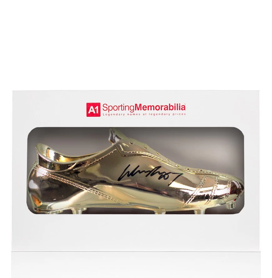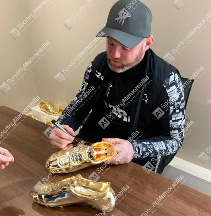 This stunning gold football boot was hand-signed by Manchester Untied & England top goal scorer Wayne Rooney. This football boot features a perfect autograph signed permanent pen – hand signed at a private signing session with A1 Sporting Memorabilia in Manchester on 23/04/2021. Each item comes complete with its own Certificate of Authenticity which serves as proof that your item is 100% genuine. **Please note – this is not real gold and is not a wearable football boot.** Presented in our premium A1 Sporting Memorabilia gift box that not only keeps your prized memorabilia protected, it is also ideal for special gifts and events.